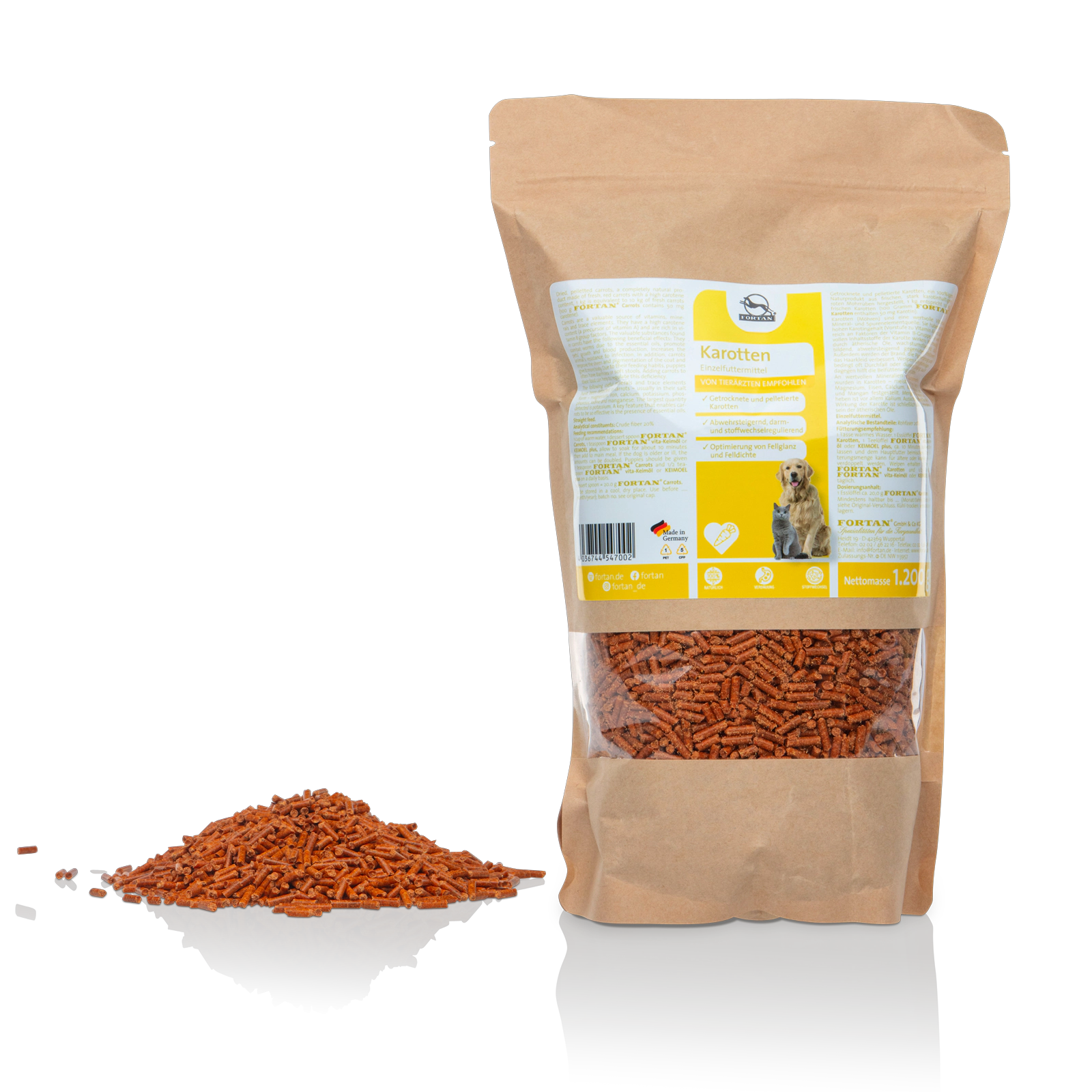 FORTAN Karotten sind ein 100%iges Naturprodukt, gewonnen aus frischen roten Mohrrüben. Durch ein schonendes Trocknungs- und Pelletierverfahren entsteht ein Konzentrat, das besonders reich an Karotin (der Vorstufe von Vitamin A) ist. Dabei entspricht 1 kg FORTAN Karotten etwa 10 kg frischer Karotten – eine bemerkenswerte Nährstoffdichte, die Ihrem Hund eine zusätzliche Quelle wertvoller Inhaltsstoffe bietet.