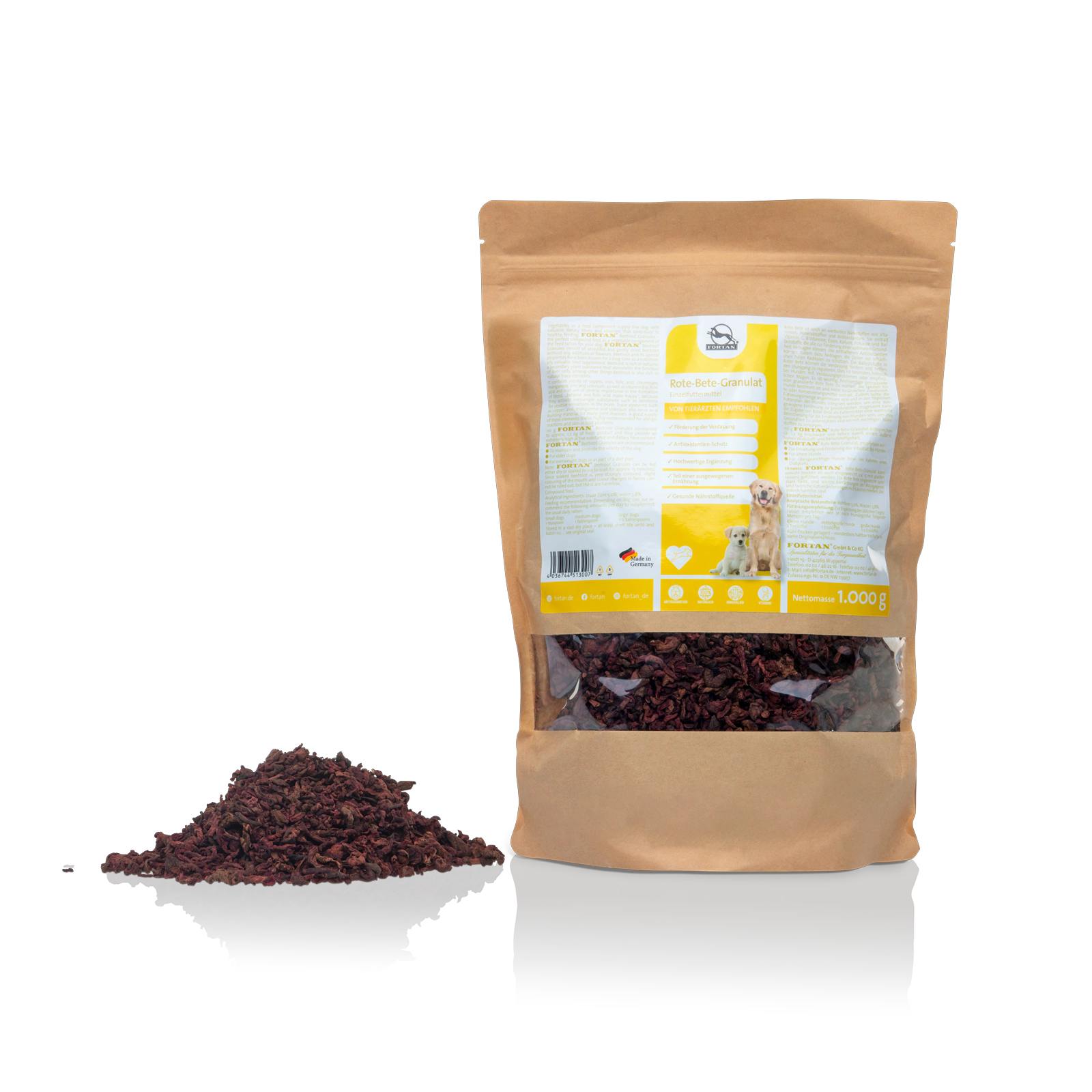 With years of experience in pet nutrition, FORTAN emphasizes carefully selected raw materials. The beetroot granules are gently processed to preserve their natural properties as much as possible. Pet owners can trust this high-quality supplement to fit seamlessly into various feeding plans.
