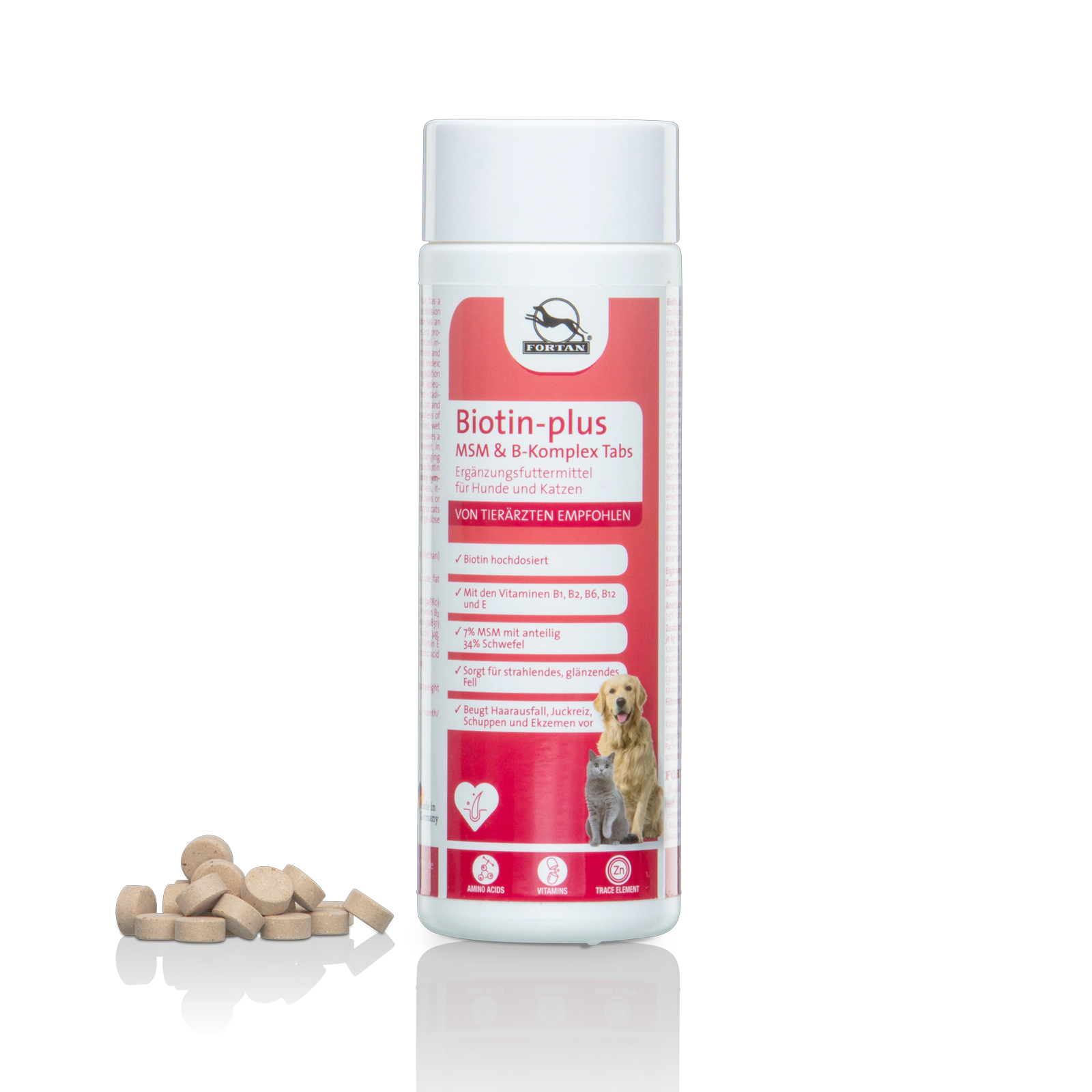 FORTAN Biotin-plus MSM combines two valuable components in a dietary supplement designed to enhance the daily nutrition of dogs and cats. Biotin, a B-vitamin, is known for its involvement in various metabolic and cellular division processes within the body. It plays a key role in carbohydrate and protein metabolism, contributing to the synthesis and utilization of certain fatty acids and the breakdown of specific amino acids.